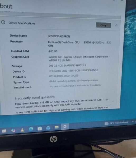 ni generation ya 5 Processor 3.20Ghz RAM 4GB hard disk 320GB screen 19inches Keyboard Mouse